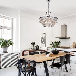 This 9-light tired crystal chandelier with a sleek chrome finish is a stunning addition to any home, adding a touch of elegance and sophistication to your dining room, living room, or bedroom. Its dazzling crystal accents catch the light beautifully, creating a warm and inviting ambiance that is perfect for any occasion. The chandelier's multi-tiered design adds a sense of depth and dimension to your space, making it an eye-catching centerpiece that will impress your guests. Whether you're hosting a dinner party, relaxing in your living room, or preparing for bed, this chandelier is sure to elevate your decor and create a luxurious atmosphere.