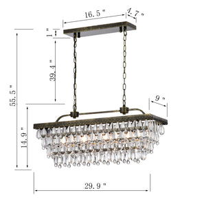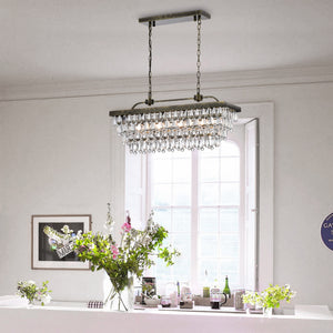 This stunning chandelier boasts a luxurious design, with two tiers of sparkling crystal pendants arranged in a rectangular shape. The copper finish adds warmth and richness to the overall look, creating a statement piece that is both modern and timeless. With four lights, this chandelier provides ample illumination while casting a warm and inviting glow in your space. Perfect for formal dining rooms or grand entryways, this chandelier is sure to impress and elevate any room it is placed in.
