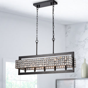Introducing our Rectangular Beaded 5-Light Chandelier, a captivating blend of sophistication and artisanal charm. Crafted with meticulous attention to detail, this exquisite fixture features cascading strands of beads elegantly arranged within a sleek rectangular frame. The juxtaposition of the clean lines and the intricate beadwork creates a stunning visual effect that adds a touch of bohemian elegance to any space. Illuminate your dining room, foyer, or living area with the warm and inviting glow cast by this timeless chandelier, and let its graceful silhouette become the centerpiece of your decor. Elevate your ambiance with a touch of understated luxury and embrace the enchanting allure of this radiant lighting masterpiece.