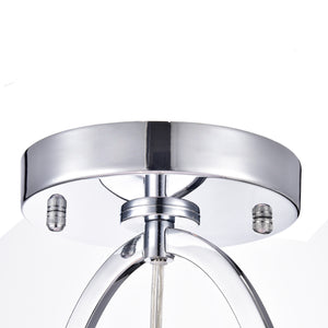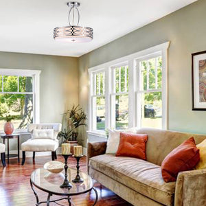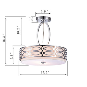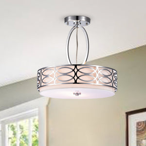 This 3-light drum semi-flush mount with a chrome finish is a modern and stylish lighting fixture designed for use in any room of the house. The fixture features three lights encased in a drum-shaped shade that sits close to the ceiling, creating a semi-flush appearance. The chrome finish adds a touch of sophistication to the design, making it a great choice for contemporary or transitional decor styles. This type of fixture is easy to install and is a popular choice for areas with low ceilings. It provides ample illumination while taking up minimal space, making it a practical and attractive lighting solution for any home.
